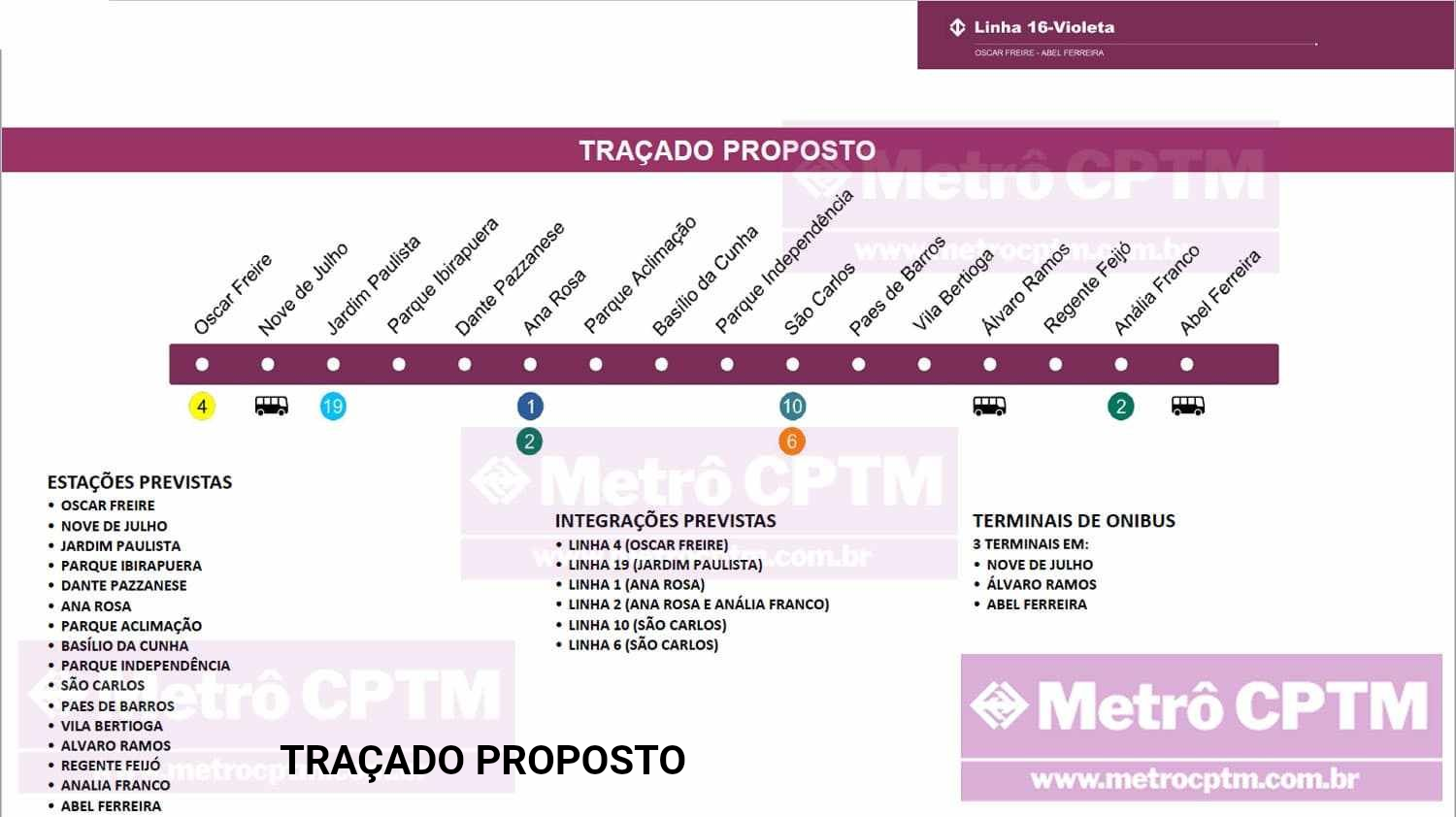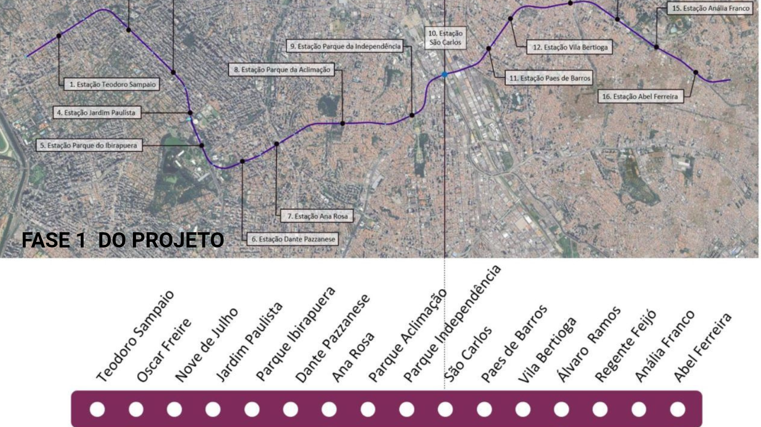 A Linha 16 Violeta promete ligar a região dos Jardins até Cidade Tiradentes, com 32 km de extensão.